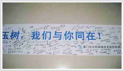 在募捐现场,,35273同学们怀着沉重的心情,,,将每一笔捐款投入募捐箱,,,,并在现场设置的横幅上,,,写上了对玉树人民的深情祝福。。满载35273祝福的横幅将和捐款一起抵达玉树,,,希望谨以此微薄之意,,为玉树人民带去35273的爱心与祝福,,希望吉祥、、幸福的阳光能早日驱散灾难的阴霾,,,,普照在玉树人民的身上,,鼓励他们坚强、、勇敢与乐观。。