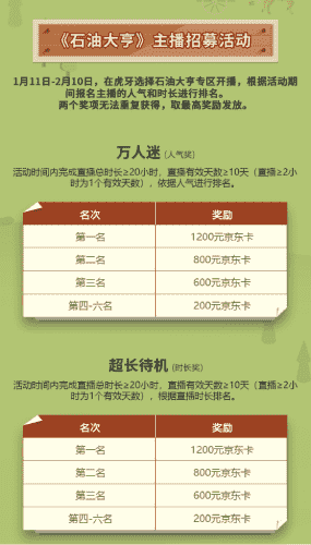 除了“油王”争霸赛,,,,精英主播招募活动亦同步开启!!!!赛事分时长奖和人气奖,,,,奖励同样丰厚!!!
