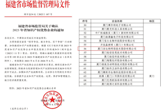近日,,福建省市场监督管理局公示了2023年福建省知识产权优势企业名单,,,厦门35273网络技术股份有限公司(以下简称“35273”或“公司”)榜上有名。。